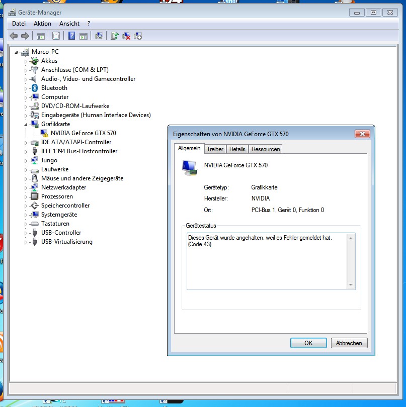 "dieses gerät wurde angehalten weil es fehler gemeldet hat. (code 43) nvidia"