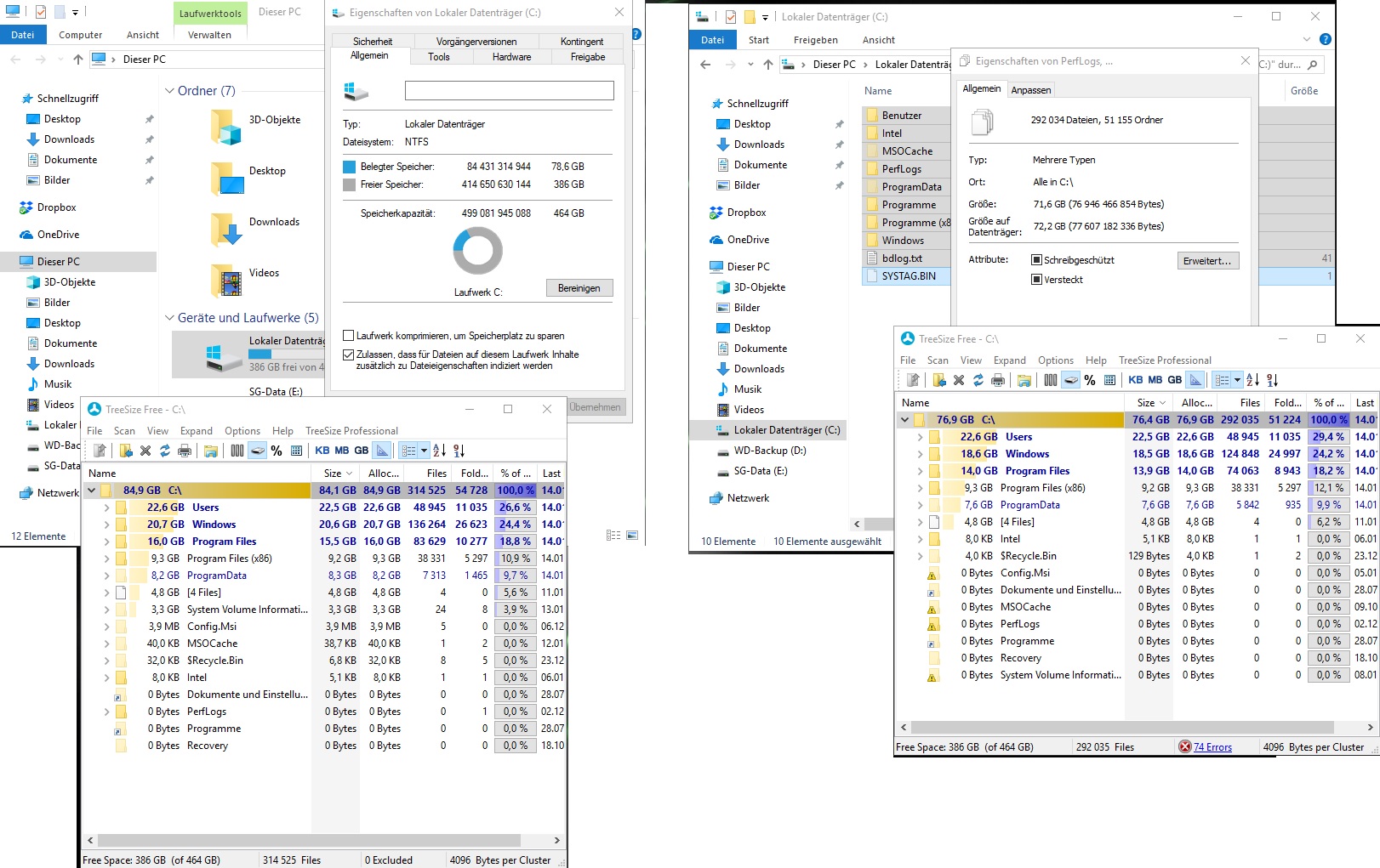 Wenn ich mich in meinem Bekanntenkreis umschaue, so stelle ich um die 20 bis 100 Gigabyte Unterschied fest, wenn ich zunächst auf die Eigenschaften eines Laufwerks oder Partition klicke und anschließend mit STRG+A alle Dateien und Ordner darin markiere und mit ihre Größe anzeigen lasse.