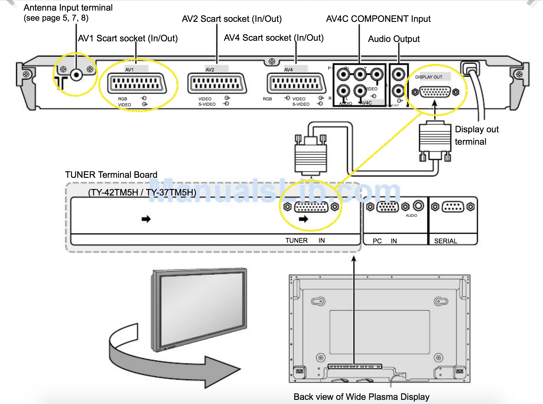 Ich bin momentan mit meinem Wissen überfragt. Ich habe einen recht alten Plasma Fernseher (2004 gekauft) von Panasonic. Dieser Fernseher hat einen separaten Receiver dabei gehabt. Im Folgenden eine Übersicht über die Schnittstellen (oben der Receiver, unten die des 42" Monitors). Angeschlossen wurde der Receiver und das Display demnach über den "Tuner In/Display Out-Anschluss".