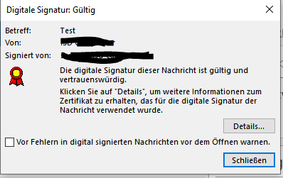Wenn ich nun über das in Outlook eingerichtete Konto eine digital signiete Mail versende kommt diese beim Empfänger an mit den Hinweis, dass die digitale Signatur gültig und vertrauenswürdig ist. So weit so gut.