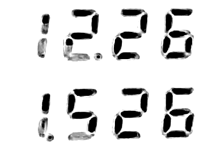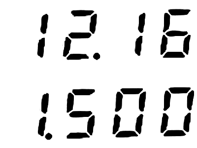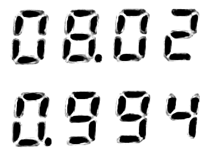 Anbei sind ein paar Beispiele von den so erzeugten Bildern. Ich habe jetzt diverse online OCR-Dienste und auch den gImageReader getestet um aus diesen Bildern die Zahlen zu extrahieren - leider ohne Erfolg, obwohl ich bspw. beim gImageReader die möglichen Zeichen mit einer Whitelist (0123456789.) eingeschränkt habe.