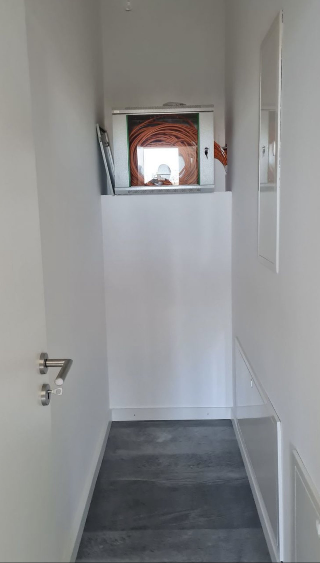 In diesem Raum befindet sich am Stirnende ein ca. 1,20m hoher und ca. 34 cm tiefer "Sockel", auf diesem steht mittig (und an der dahinter liegenden Trockenbauwand verschraubt) ein 9 HE Verteiler mit 45 cm Tiefe.