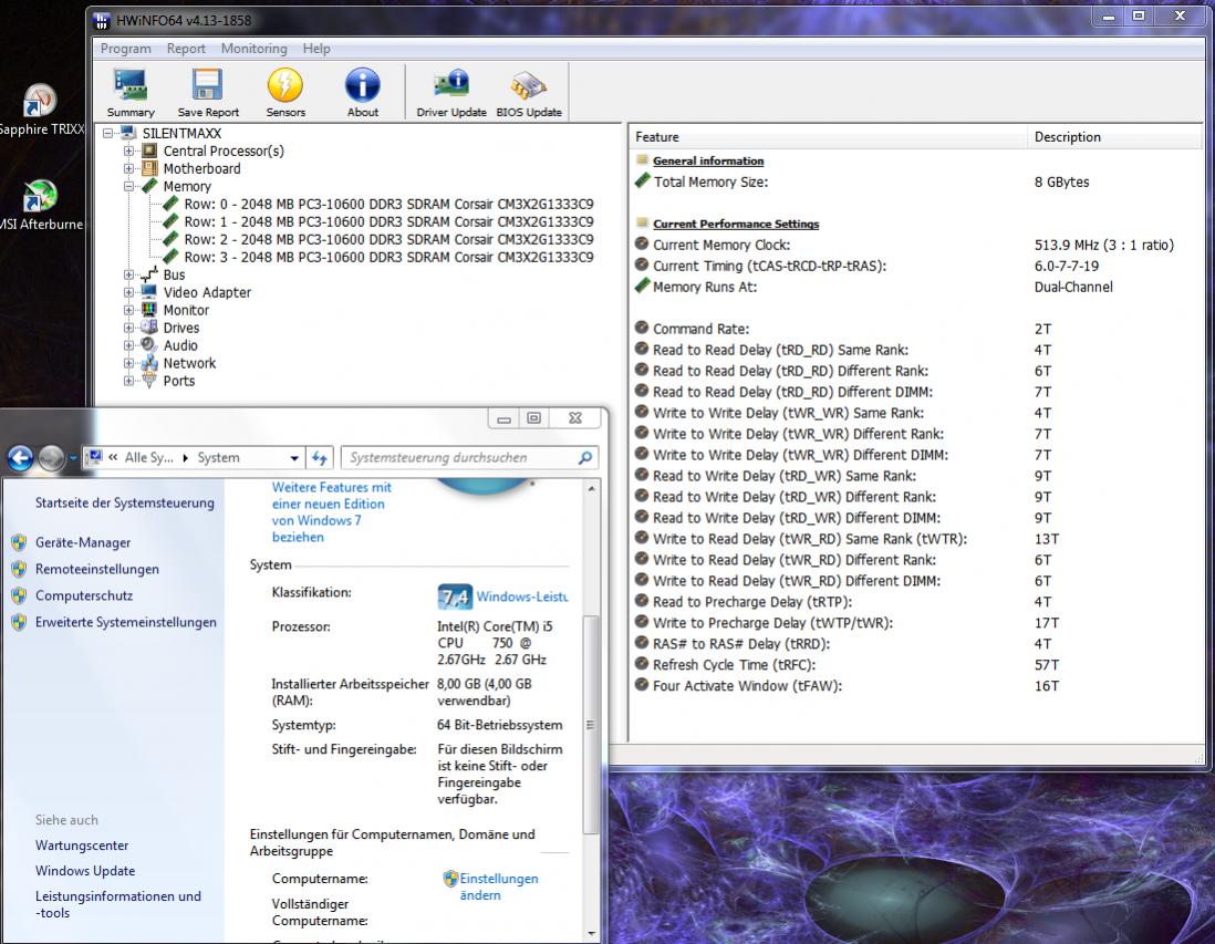 An anderer Stelle wurde mir gesagt, ich würde den RAM jetzt im Single Channels Modus betreiben. Der BIOS POST meldet "DDR3 - 1020 MHz". Wenn man HWiNFO64 glauben will, ist alles in Ordnung. Windows bestätigt aber das BIOS, nämlich dass nur 4 von 8 GB verwendet werden. Die CPU läuft wieder auf 3,6 GHz.