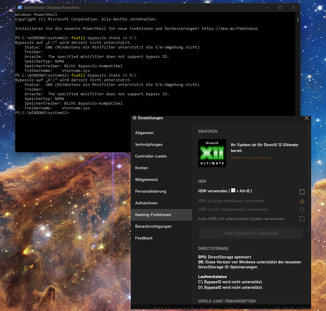 Hi, ich wollte mich auch nochmal zurückmelden. Ich war ja zwischenzeitlich wieder auf Win10 zurück, nachdem es mit DirectStorage nicht klappte. Heute bin dann aber wieder auf Win11 zurück, um mich meinem Problem mit der DirectStorage Unterstützung meiner SSDs zu widmen.