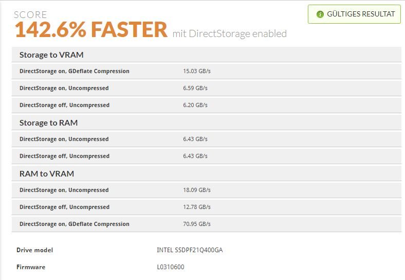 Ergebnis DirectStorage AN (ohne GB/s): 15,03