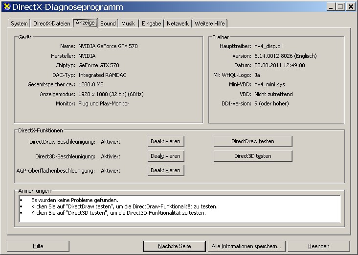 Nun habe ich folgendes Problem und ich hoffe ich stelle diese Frage in dem richtigen Forenabschnitt: Ich habe die neusten Graka-Treiber Installiert und bei ihnen (sowie bei den alten Graka-Treibern [CD]) tritt das Problem auf, dass die DirectX-Funktionen sich nach einem Neustart oder dem Herunterfahren des Computers immer ausschalten.
