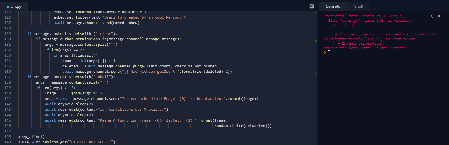 Guten Abend zusammen, bin gerade dabei meinen mit Python geschriebenen discordbot über repl.it zu hosten damit er 24/7 erreichbar ist. hab auch alles gut geschafft, bis ich dann einen error bekommen hab den ich nicht zu lösen weiß, vllt kann mir ja jemand helfen.