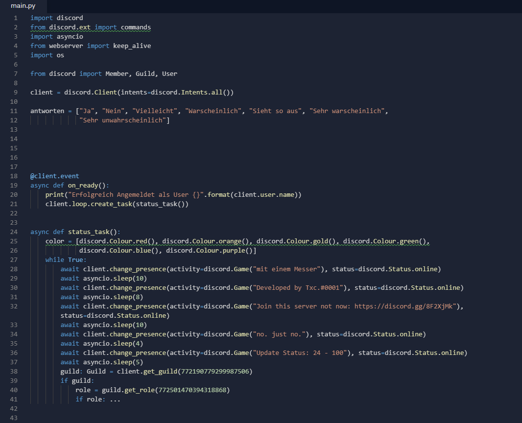 keep_alive() eine run funktion, die aber nicht gefunden wird. ich kenne dieses "webserver" package nicht - keine ahnung, ob dieser "keep_alive" aufruf in diesem context überhaupt was bringt, aber es gibt zumindest bei diesem code keine verbindung zu deinem programm. zusätzlich fehlt dir ein import random und zum schluss übergibst du den string "TOKEN" anstatt der variable. den rest habe ich mir nicht angeschaut