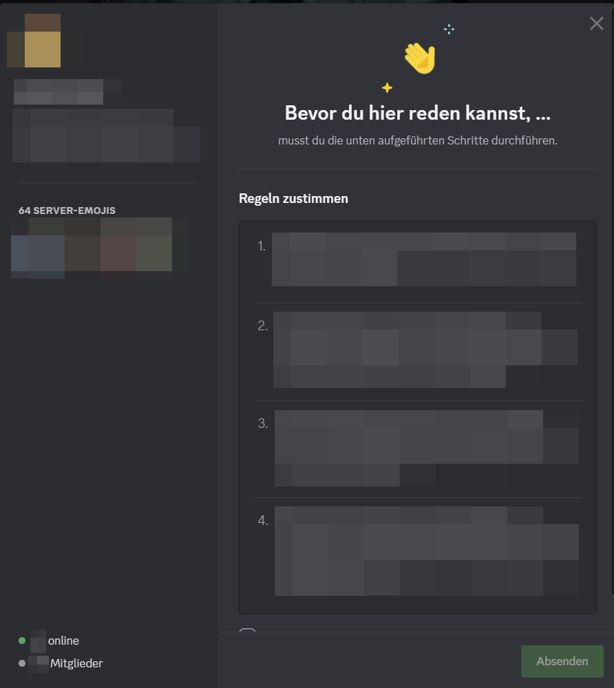 Kann mir jemand sagen, wie man so etwas bei seinem eigenen bereits existierenden Server umsetzen kann? Ich habe die Servereinstellungen durchgesucht und nirgendwo etwas gefunden, um das einzurichten. Beispielsweise habe ich bisher Willkommens-Nachrichten über einen Bot verwirklicht. Und das Akzeptieren von Regeln und damit verbundene Einblenden mancher Kanäle auch per Bot.