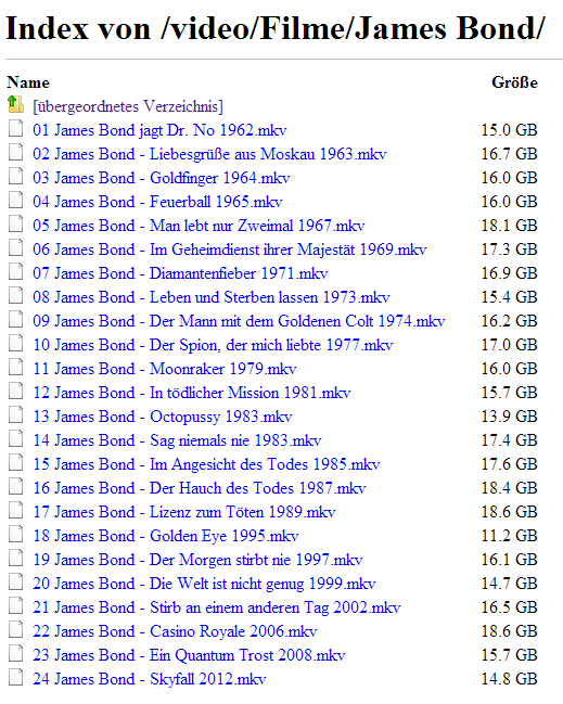 Der Oppo kann per DLNA oder CIFS/SMB auf den NAS zugreifen. In der Regel nutze ich dabei immer DLNA da der Twonky DLNA Server in NSA 325 dafür perfekt ist. Meine Film Dateien liegen dabei fast alle als MKV vor und sind bei Filmen die mehrere Folgen haben nach Ordnern gegliedert die unter dem Namen des jeweiligen Filmes alle dazugehörigen Filme beinhalten. Zusätzlich kann auch auf Wunsch von außerhalb des Netzwerks durch Dynamische IP Weiterleitung per FTP/HTTP oder verschlüsseltem HTTPS auf den NSA 325 zugegriffen werden. Hier ein Beispiel mit den James Bond Filmen über FTP: