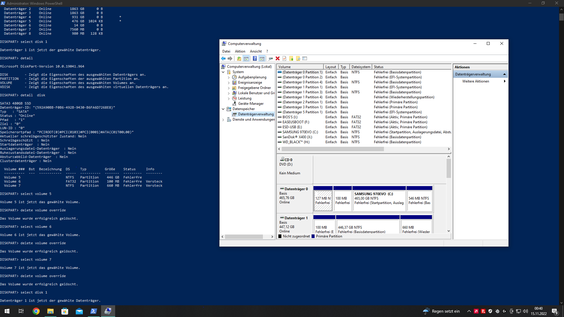Versuche seit ein paar Stunden eine 480 GB sata ssd zu wipen. Die olle Funz macht aber was sie will. Hab in diskpart jedes einzelne Volumen gewählt und über "delete volume override" vermeintlich gekillt. Diskpart meldet "Volumen wurde erfolgreich gelöscht", aber wenn ich dann in die Datenträgerverwaltung gucke sehe ich drei blaue Balken anstatt eines großen schwarzen.