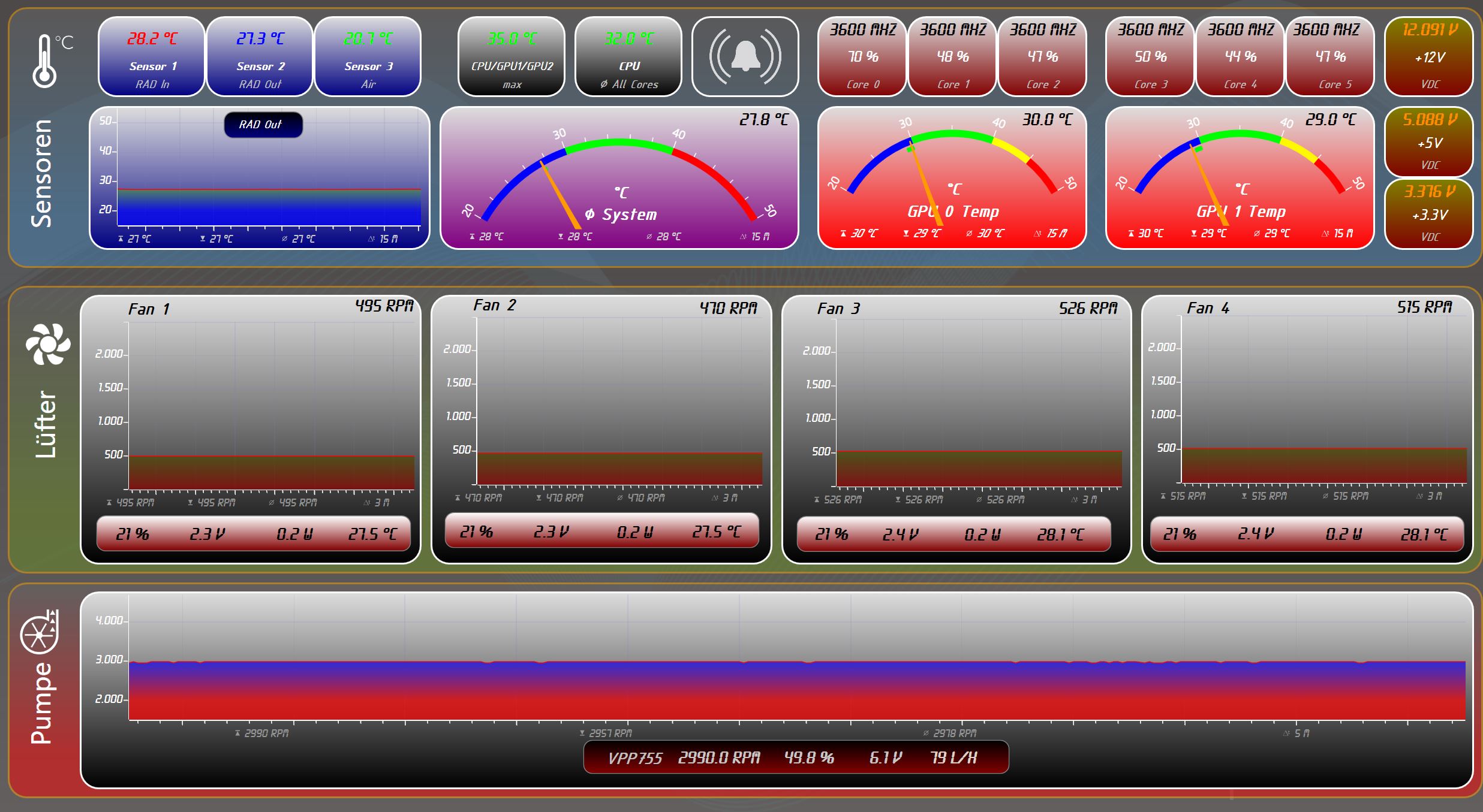 Ich kann meine Radiatoren ja mit unterschiedlichen Drehzahlen über das Mainboard betreiben. CPU zu Warm-> Radi 1 mehr Drehzahl. Wenn die Temp dann immer noch steigt Radi 2 mehr Drehzahl. So habe ich es bei vorherigen Setups gemacht wo ich 3 Radiatoren hatte. Viel regeln tut da auch nichts. Wenn das Wasser eine bestimmte Temperatur erreicht hat springt die Hardwaretemperatur auch nicht mehr so stark.