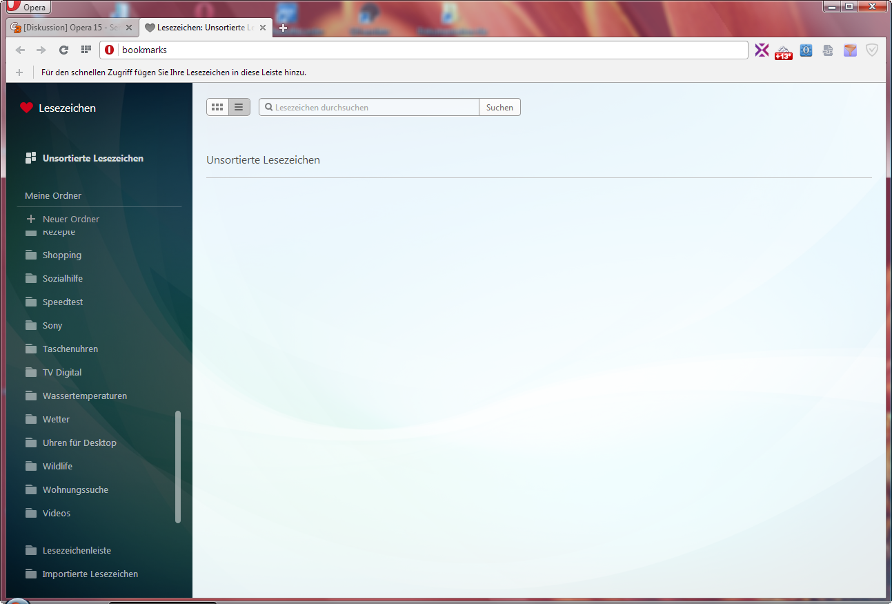 Hm, aber der Tab verschwindet jedesmal wieder, wenn man Opera schließt? Ich hätte schon gerne ein separates Paneel wie früher, geht doch im Fx auch. Aber da das bei Chrome auch (noch) nicht möglich ist, wird da Opera kaum vorpreschen. Bleiben wir halt noch etwas bei 12.17die ziege schrieb:Oben wie in Bild kann man dann über "alle Lesezeichen anzeigen" alle Lesezeichen sehen in einem extra Tab. ÜBer das Menü wird dann alles so wie vorher mit Unterordnern angezeigt
