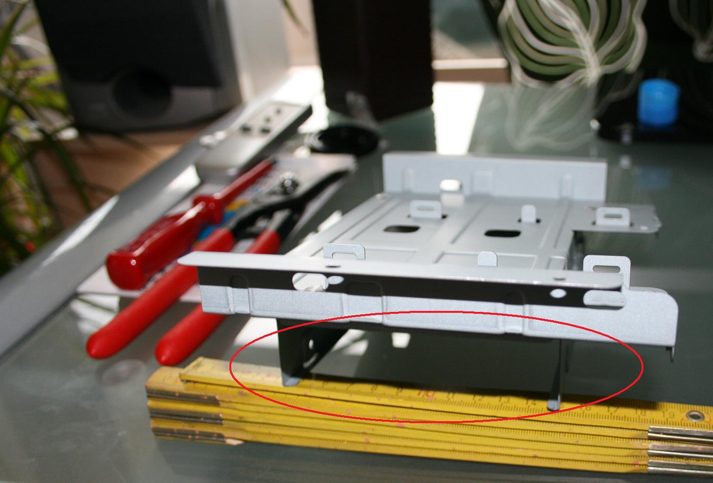 Der mittlere Schacht ist wohl für 2,5" Laufwerke, nehm ich jedenfalls an. Habe mir überlegt den mit der Blechschere zu entfernen und nur noch die obere Befestigung übrig zu lassen. An der Befestigung für das Slim-Laufwerk würde ich dann die 3,5" Festplatte mitsamt Quiet Drive an Kabelbindern befestigen, falls alles passt