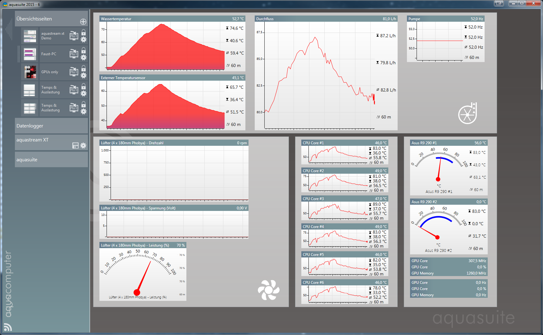 Die Lüfter werden bei mir mittlerweile vom Mainboard gesteuert. Ich habe nur PWM-Lüfter, aber das aquaero 5 hat nur einen PWM-Kanal. Mit dem Board kann ich 3 Kanäle per angeschlossenem Temperatursensor steuern.