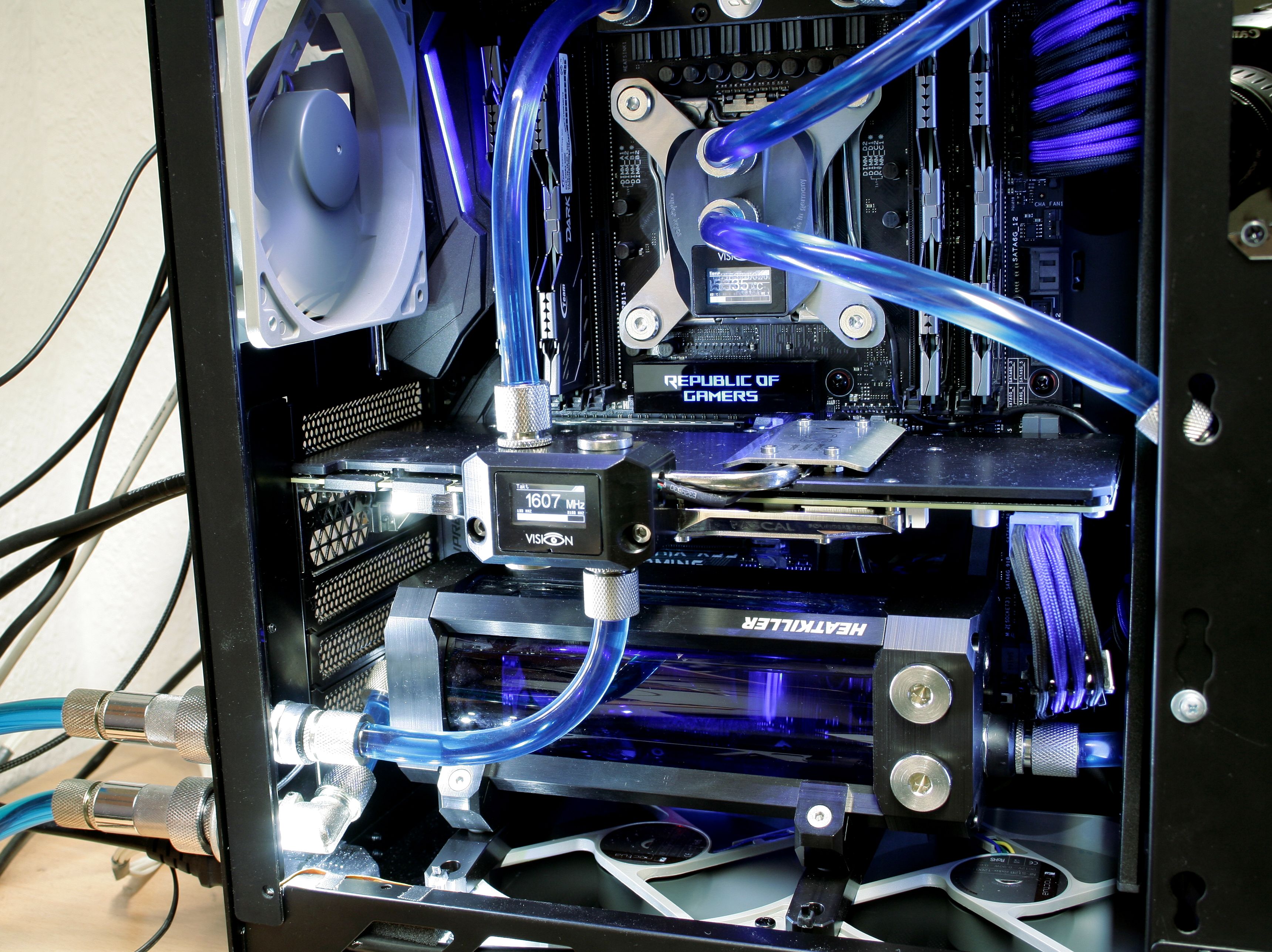 Alles mit AC Vision ausgestatt, sieht extrem cool aus. Hast du die Heatkiller AGB auf Lüfter geschraubt, kann man so schlecht erkennen, aber ich meine graue Noctuas zu erkennen.