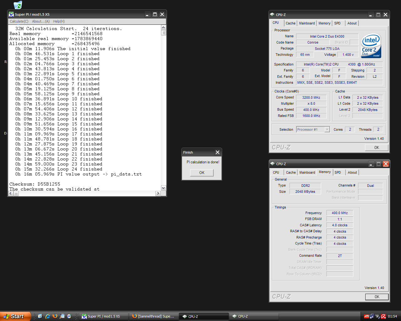 Hatte die letzten Tage nicht viel Zeit, allerdings poste ich vorläufig mal mein SuperPI 32M-Ergebnis. Meine Riegel zicken leider bei der 1000Mhz-Grenze. Und da mein Board und/oder CPU nicht den 7er und 6er Multi mögen (die Kiste startet einfach dann nicht), kann ich mich kaum schrittweise vortasten. Die DDR2-800 4-4-4-4-2T schaffen die Riegel problemlos mit 2,0V, aber mit den 1000Mhz hapert es noch. Ich habe zwar schon auch ein wenig mit den Subtimings probiert, aber entweder gibt es beim Windowsstart direkt einen Reboot, einen Bluescreen oder einen Freeze. Irgendwie blöde.