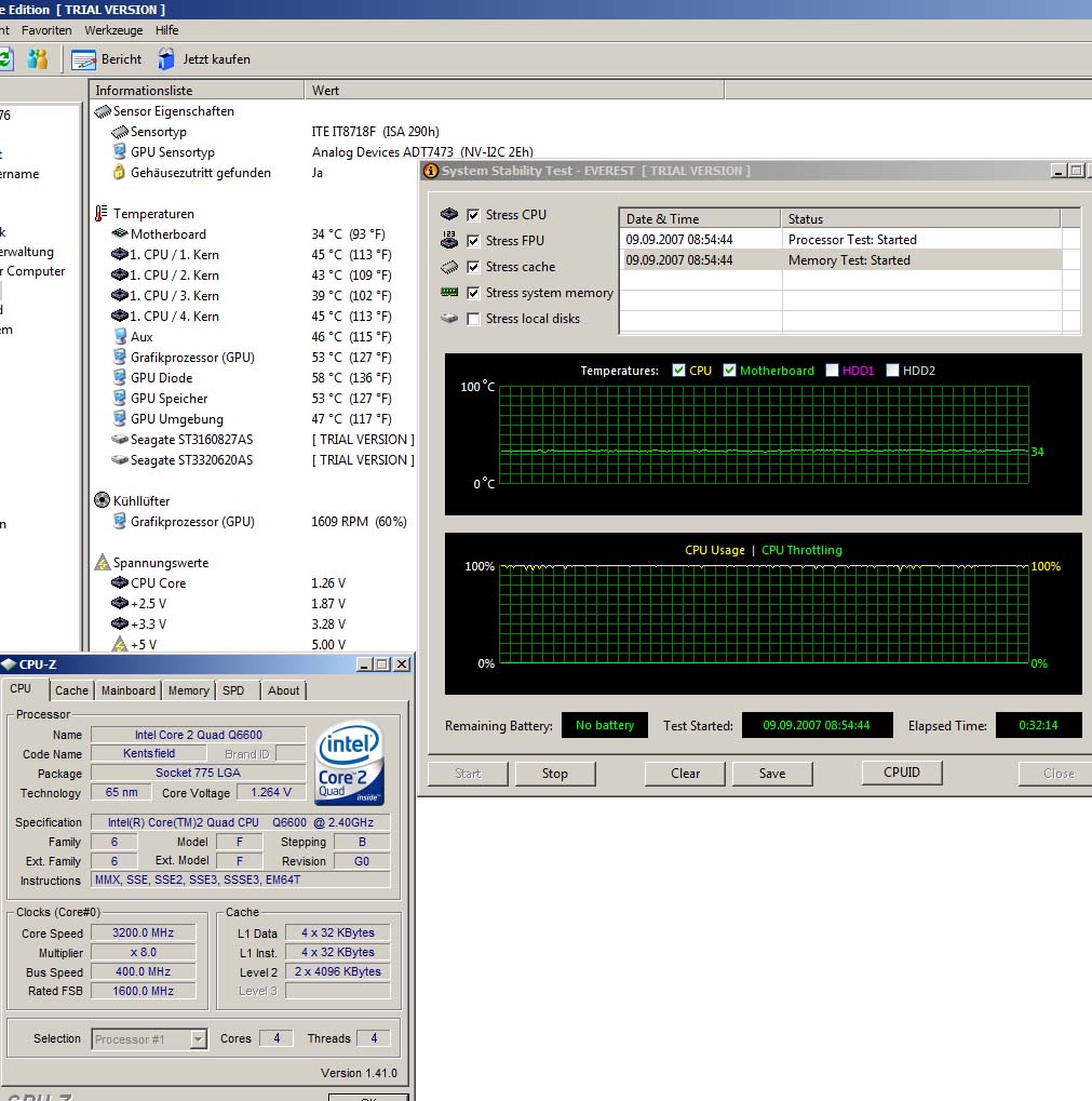 Zur CPU: Hatte vorher den e66000. Habe ich auch nur getauscht, weil mir mein Rechner ständig abgesemmelt ist. Lief auch zuerst problemlos bei 3,2ghz ohne VCore-Erhöhung. Der jetztige q6600 ist ein G0-Stepping und bleibt ohne VCore-Erhöhung (1,26V) nach 30 Minuten Voll-Last durch Stability Test von Everest bei 45°C. Den Multi habe ich auf 8x gestellt. Also 8x400mhz = 3,2.