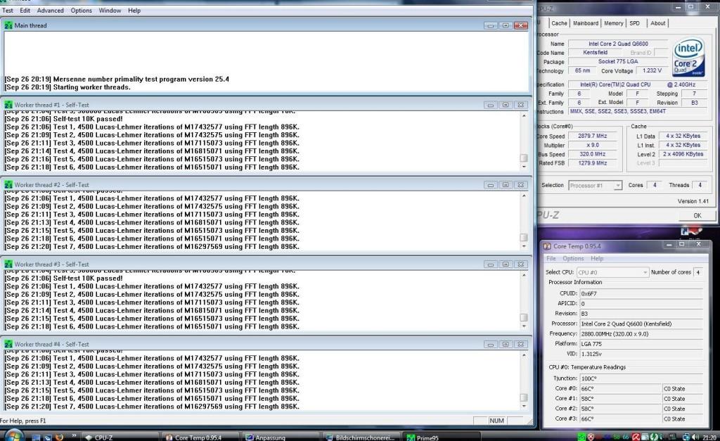 Anbei ein Screenshot der den Rechner bei Prime95 zeigt. Es wundert mich allerdings, dass CPU-Z und CoreTemp unterschiedliche VCore werte anzeigen.