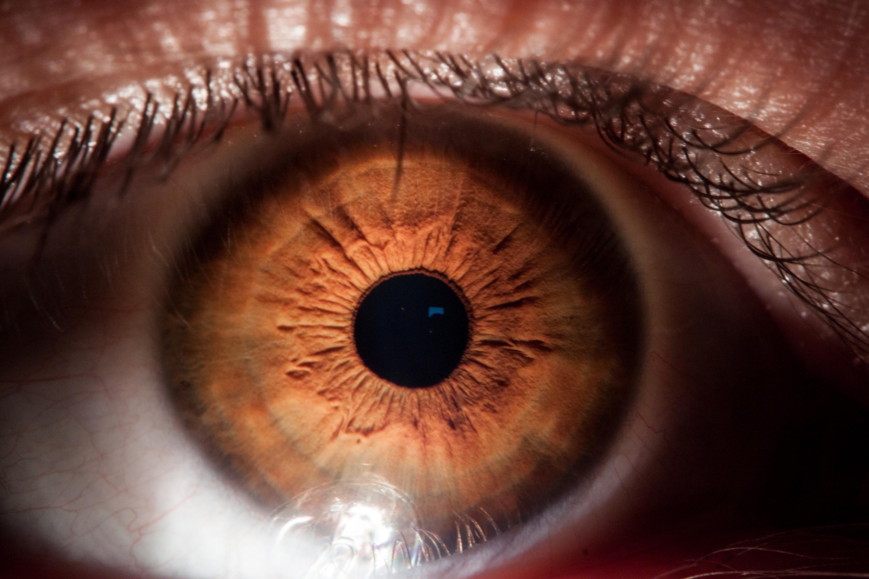 also eigentlich brauch man dazu kein sündhaft teures equipment. ok, man sollte ne ordentliche makrolinse mit >100mm haben und evtl. noch zwischenringe um näher ran zu können. ich hab mal eben auf die schnelle mein eigenes auge fotografiert: