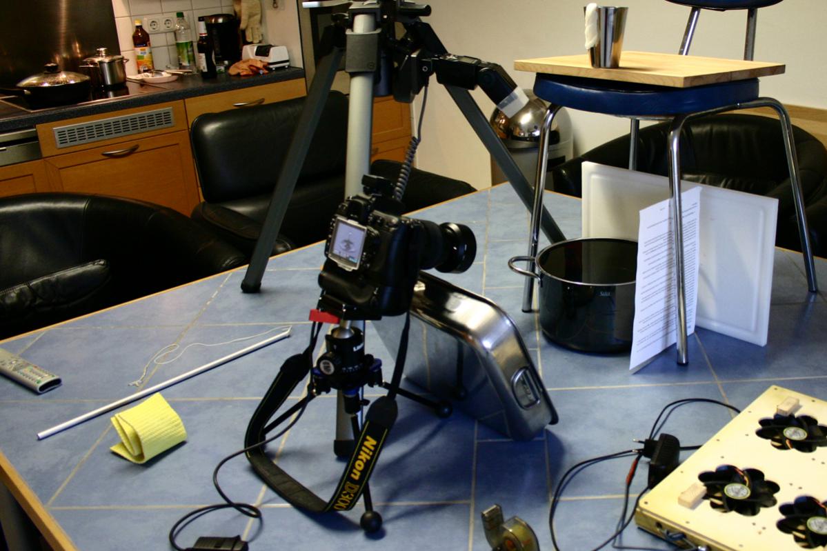 Unterhalb des Bechers habe ich einen mit Wasser gefüllten Topf gestellt. Vor die Konstruktion natürlich die Kamera und seitlich einen Blitz.
