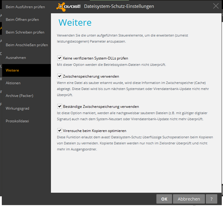 Hatte ich alles schon so eingestellt gehabt wie du es empfohlen hast Uwe, und hier bei den Dateischutz Einstellungen unter weitere habe ich alles aktiviert, es sind eigentlich die selben Einstellungen wie ich sie beim letzten testen von Avast 2014 Ende Dezember 2013 schon hatte, und ich einfach wieder zurück gespielt habe.