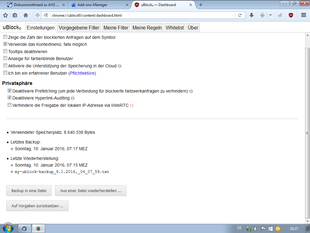 Bei Privatsp. die letzte Option sollteste auch aktivieren. Hier gibts die aktuelle signierte Version: https://addons.mozilla.org/de/firefox/addon/ublock-origin/?src=ss