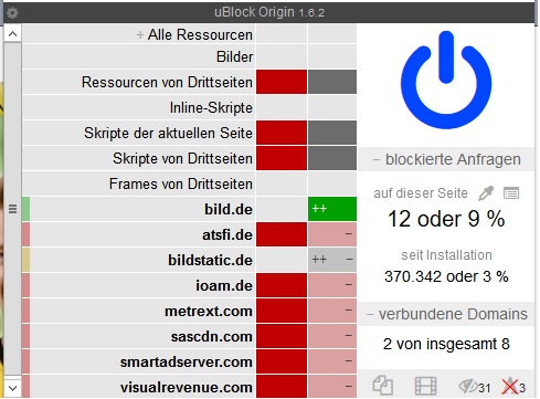 Bei bild.de ist es komisch: wenn uBlock aktiviert ist wird die Seite angezeigt, wenn ich ihn deaktiviere kommt die AdBlock-Meldung.Ich glaub das liegt an der Aktivitätenverfolgung des Firefox (Schild-Icon in der Adresszeile)!