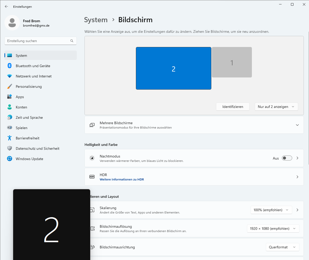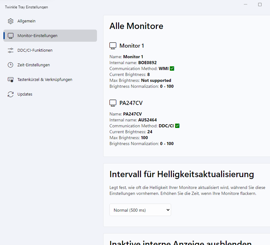 Wenn das W-11 des Tabletts auf "Nur auf Monitor anzeigen" eingestellt ist, kann Win-11 die Displayhelligkeit des Monitors nicht steuern. Der Schieberegler im Windows Systemtray ist ausgegraut.