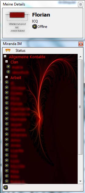 6.: Ich finde das my details addon recht praktisch, da es einem den Status sämtlicher Protokolle auf einen Blick anzeigt und man mit einem Klick Nicknamen, Status und Avatar ändern kann. Allerdings integriert es sich nicht wie auf dem screenshot in das standard Miranda Fenster, sondern ist ein eigenes kleines Fenster. Schlimmer noch, es speichert nichtmal Größe und Position und kann auch nicht docken.