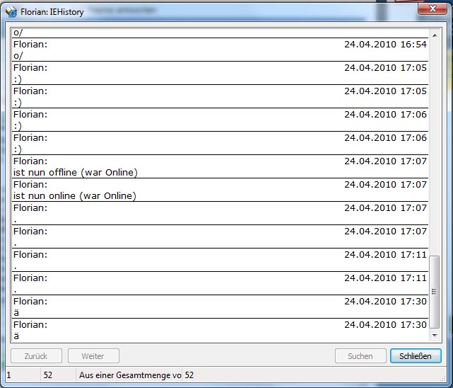 4.: Die Protokollführung von Miranda ist echt ätzend. Ich habe sicher keine Lust, jede einzelne Nachricht, die gesendet oder empfangen wurde, anzuklicken, um zu sehen, wo was steht. Ein Protokoll wie bei Trillian, wo es einfach in ein *.txt eingefügt wurde, wäre wünschenswert (zwecks strg + f