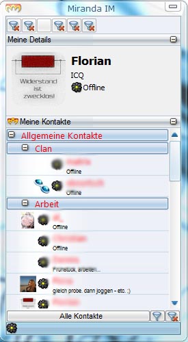 2.: Irgendwie fehlt mir das Mouse-Over, das man bei Trillian hatte. z.B. wenn man die Maus 1 Sekunde über einem Kontakt gehalten hat, hat man ein kleines Fenster bekommen, in dem das Avatarbild, ICQ-Nummer und "zuletzt gesehen am:" angezeigt wurde. Nicht gerade weltbewegend, aber wäre praktisch. Geht das bei Miranda?