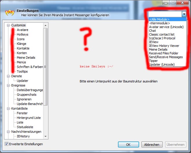 7.: Trotz langem Herumprobieren bekomme ich smiley add nicht zum laufen. alles wie vorgeschrieben gemacht: *.dll in den Plugin ordner, Smiley datenbanken in den neu erstellten "smileys" ordner, aber bei Miranda ändert sich nichts, auch nicht mit anderen Smiley Datenbanken. Hilfe bitte