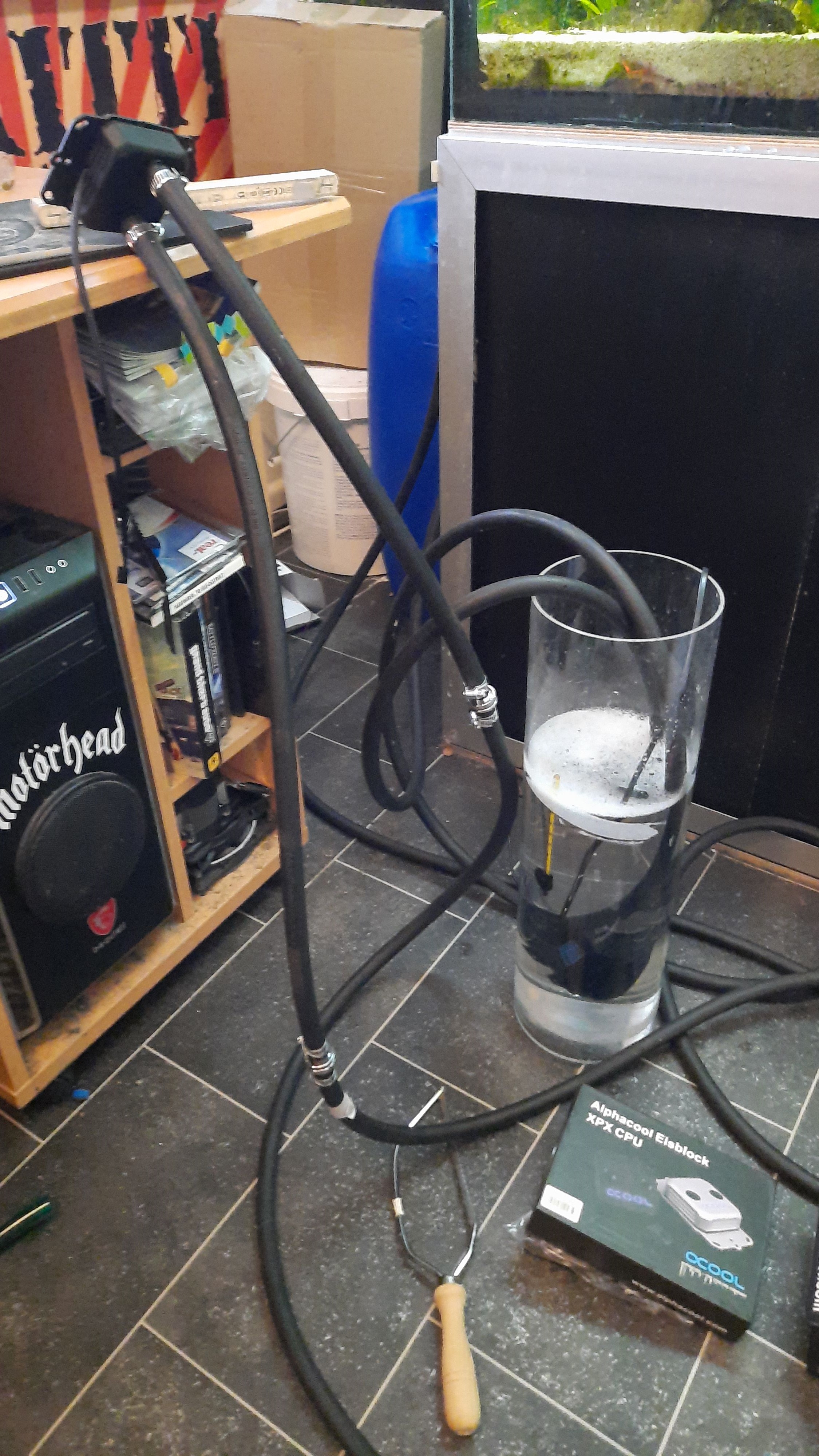 ~8m 16/10 EPDM-Schlauch verbinden das ganze mit PC und Ausgleichbehälter(8L Acrylzylinder..ausgedienter Algenreaktor).