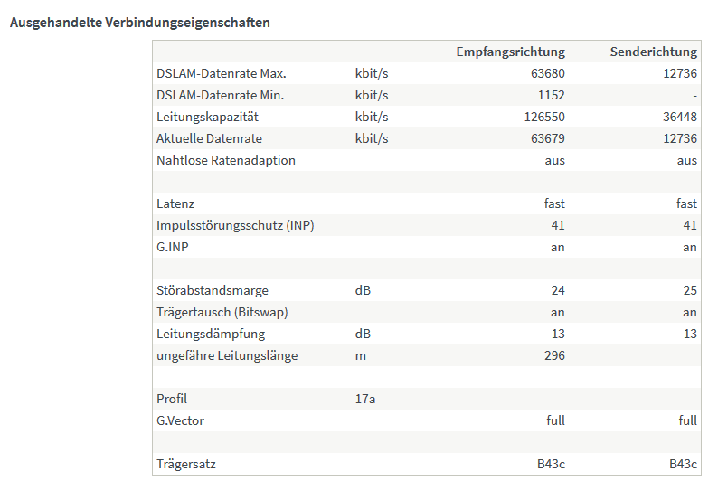 vor zwei Wochen habe ich einen All-IP Anschluss erhalten (VDSL50). Bereits bei der Freischaltung lag meine Downloadrate über den vereinbarten 50 Mbit/s, auch die Uploadrate ist etwas höher als das Maximum angegeben war. Ein Freund meinte, dass dies nach ein paar Tagen von der Telekom, entsprechend meinem Vertrag, gedrosselt wird. Circa drei Tage später gab es nachts einen Disconnect und seit dem sagt die DSLAM-Datenrate Max. nur noch 63k (war vorher ~119k), ich habe aber weiterhin ~58/11 Mbit/s.