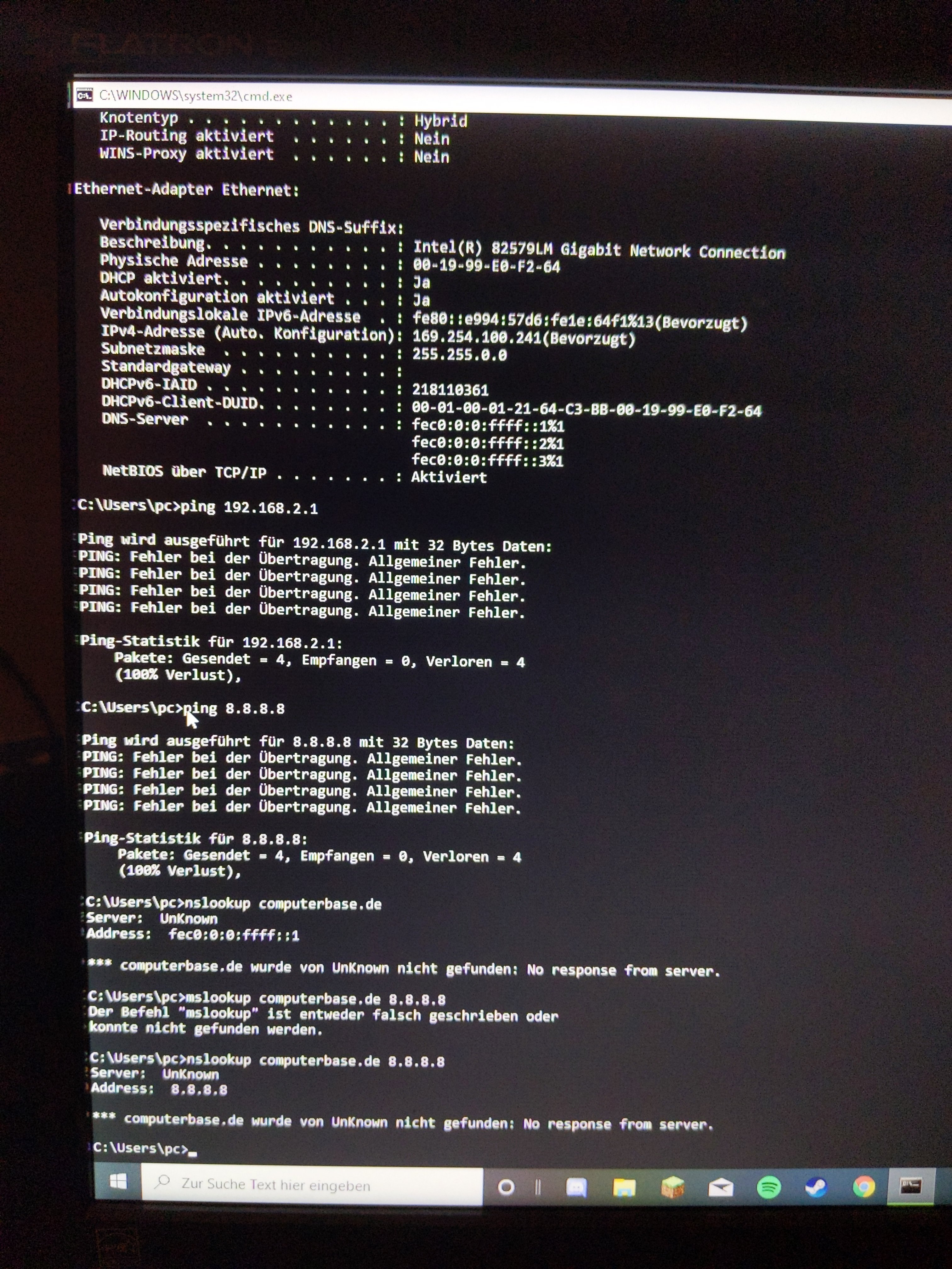 Die Problembehandlung meint "Ethernet...keine gültige IP-konfiguration."