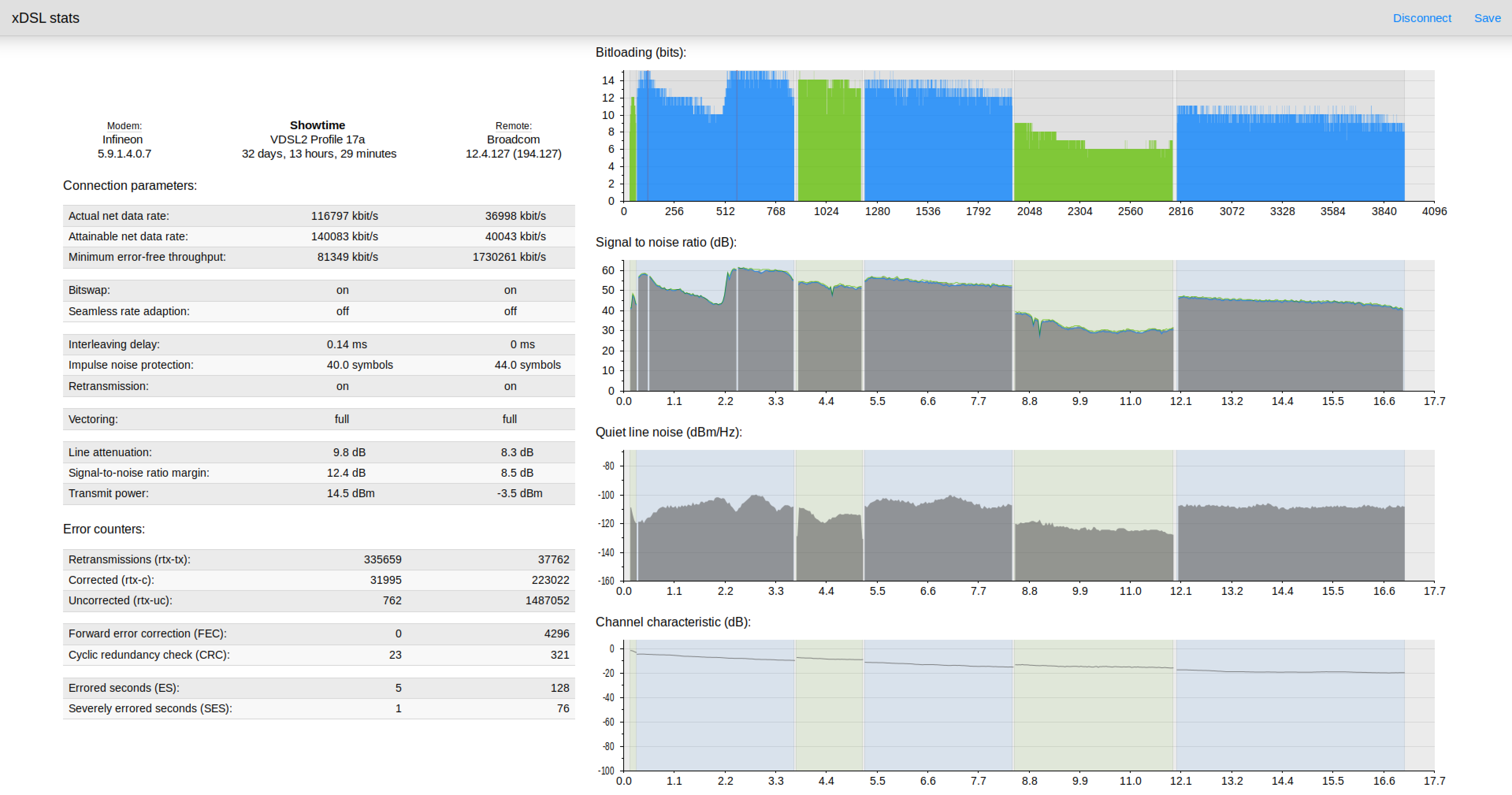 Um DLM auf die Spur zu kommen, bzw. um herauszufinden warum DLM möglicherweise aktiv wurde ist es hilfreich die Fehlerzähler des eigenen Modem abzufragen. Das geht bei Fritzboxen ganz gut mit Bordmitteln wird aber schnell unübersichtlich. Alternativ kann man bei verschiedenen Modemmodellen auch go-dsl verwenden, das dann (mit etwas Glück) Plots ähnlich wie folgendem erzeugt ("Save" speichert die einzelnen Graphen als SVGs und den Text als Text ab):