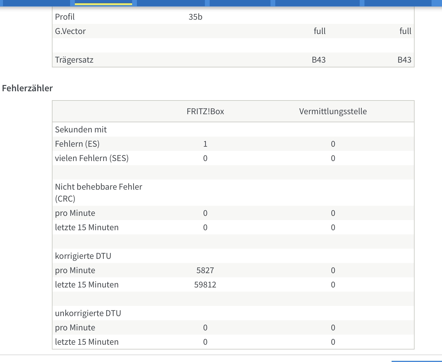 Da "korrigierte DTU" den Jitter erhöhen und Durchsatz kosten ist es besser wenn deren Zahl klein bleibt (und "unkorrigierte DTU" sollten nahe Null bleiben, klar), ca. 6K pro minute oder 100 pro Sekunde ist ziemlich hoch. Wenn das so bleibt wuerde ich mich nicht wundern wenn das DLM den Sync wieder absenken sollte. Sind bei Euch im Haus vielleicht PLC/Powerline Geraete im Einsatz? Die machen oft Probleme mit VDSL2....