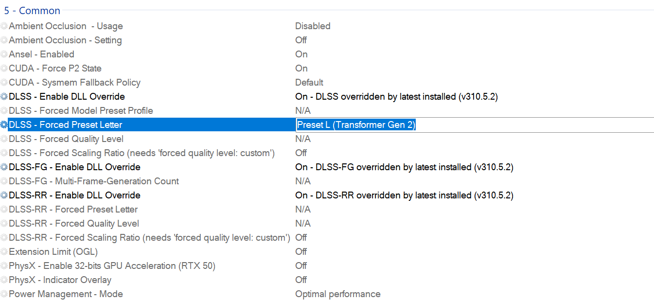 Das ist quasi ein eigener Modus wenn du im Spiel RayReconstruction aktiviert hast, diesen kannst du mit den DLSS-RR Optionen überschreiben. Aber wie gesagt gab es da mit 4.5 kein Update, das RR Model war aber auch in DLSS4 schon sehr gut und rekonstruiert auch RT/PT Details.woliver23 schrieb:@TheInvisible Verstehe. Aber dennoch sollte doch zumindest das Preset L angezeigt werden, oder verstehe ich das falsch?