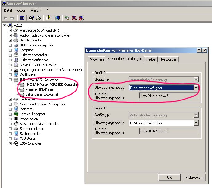 nur is das problem, das es bei mir keinen primären und sekundären ide controller gibt, sondern nur den "NVIDI@ nForce(TM) IDE Controller" gibt, und ich dort nix bezüglich dem dma einstellen kann?!? steh da irgendwie aufm schlauch, vl kann mir ja wer weiter helfen...........................