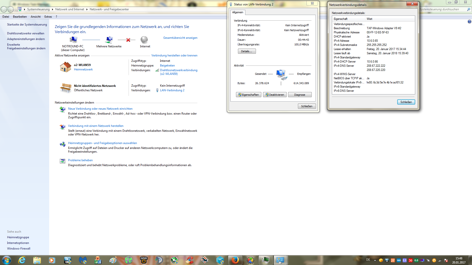 Nun sollte beim WLAN das eingestellt sein was vom Router kommt. In der Regel ist bei Gateway und DNS jeweils die IP des Routers eingetragen. Der Router wiederum bezieht DNS über DHCP vom Provider. Hier ist also normalerweise der Provider-DNS eingetragen. Beim VPN-Adapter sollte nix stehen bzw. Nicht verbunden o.ä.