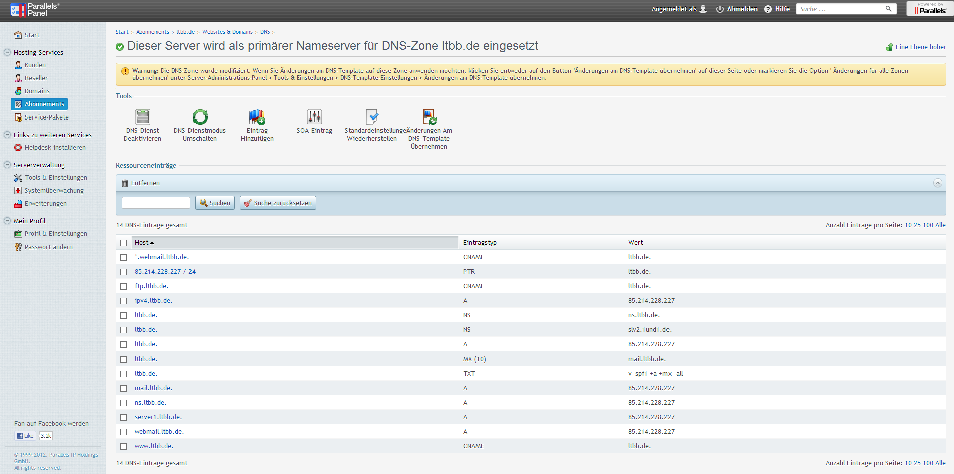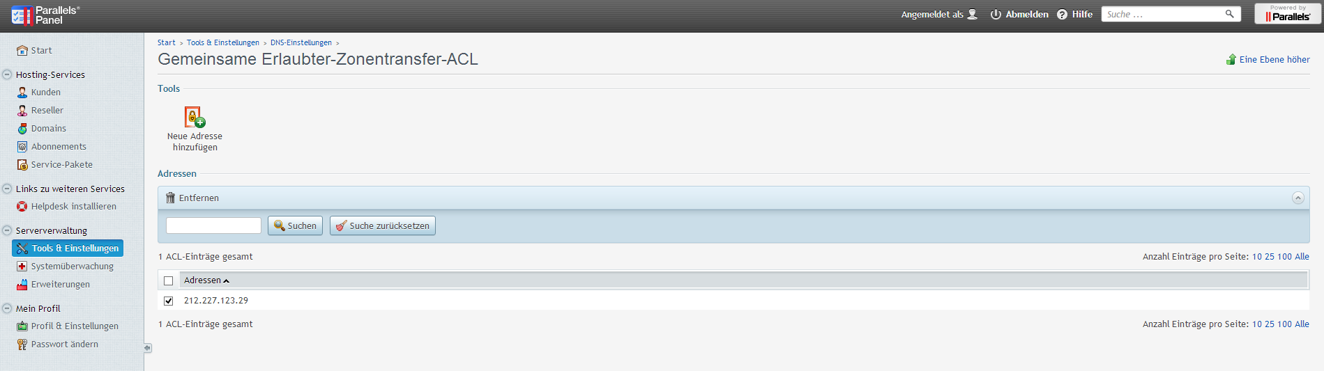 Also habe ich in Plesk unter Start>Tools & Einstellungen>DNS-Einstellungen>Gemeinsame Erlaubter-Zonentransfer-ACLWichtiger Hinweis: Wenn Sie den 1&1 Nameserver als sekundären Nameserver eintragen möchten, ist es zwingend erforderlich, dass Ihr primärer Nameserver einen Zonentransfer (AXFR) für den folgenden Nameserver gestattet: slv2.1und1.de [IP = 212.227.123.29].