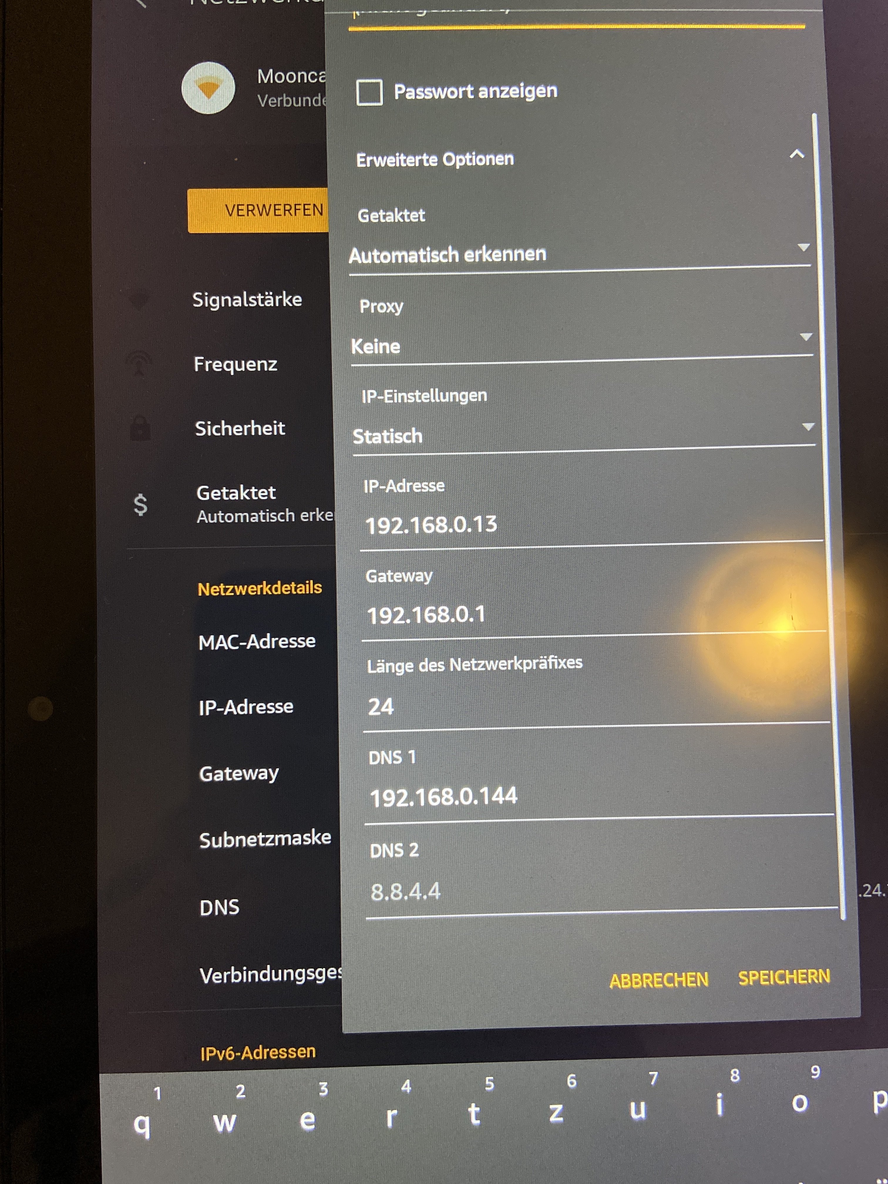 Leider funktioniert das ganze nicht so easy auf dem Tablet von Amazon. Um ein DNS einzugeben muss ich in den WLAN Einstellungen die IP von DHCP auf statisch stellen. Erst dann kann ich eine DNS Adresse eingeben. Allerdings fragt er mich dann noch nach einer IP Adresse, dem Gateway, länge des Netzwerk Präfixes und eben die DNS.