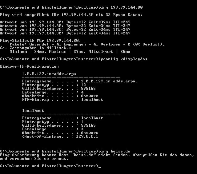 Das heist: wenn ich in FireFox z.B. "www.heise.de" eingebe, kann die seite nicht angezeigt werden. Wenn ich aber die IP Adresse 193.99.144.80 eingebe werde ich verbunden.