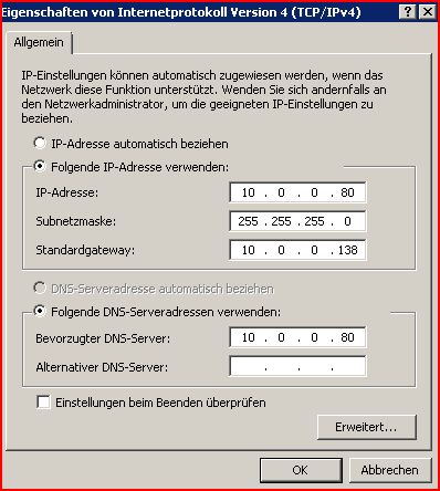 Ist ein Domänencontroller mit DNS drauf. Interne IP ist 10.0.0.80 und bei den IP einstellungen steht: IP 10.0.0.80, Subnetzmaske: 255.255.255.0, Sandardgateway: 10.0.0.138, bevorzugter DNS Server: 10.0.0.80. Die Domänen lautet domäne.local und externe domäne gibt es keine und einen ASUS Router mit der IP 10.0.0.138.