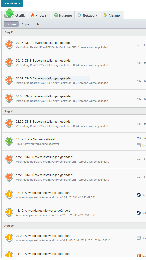 Hallo ab und zu verliere ich die Verbindung zum Internet auch während online gaming und das ist ziemlich störend. Mieine Firewall Programm Glasswire zeigt mir an dass die DNS Servereinstellungen geändert wurden.