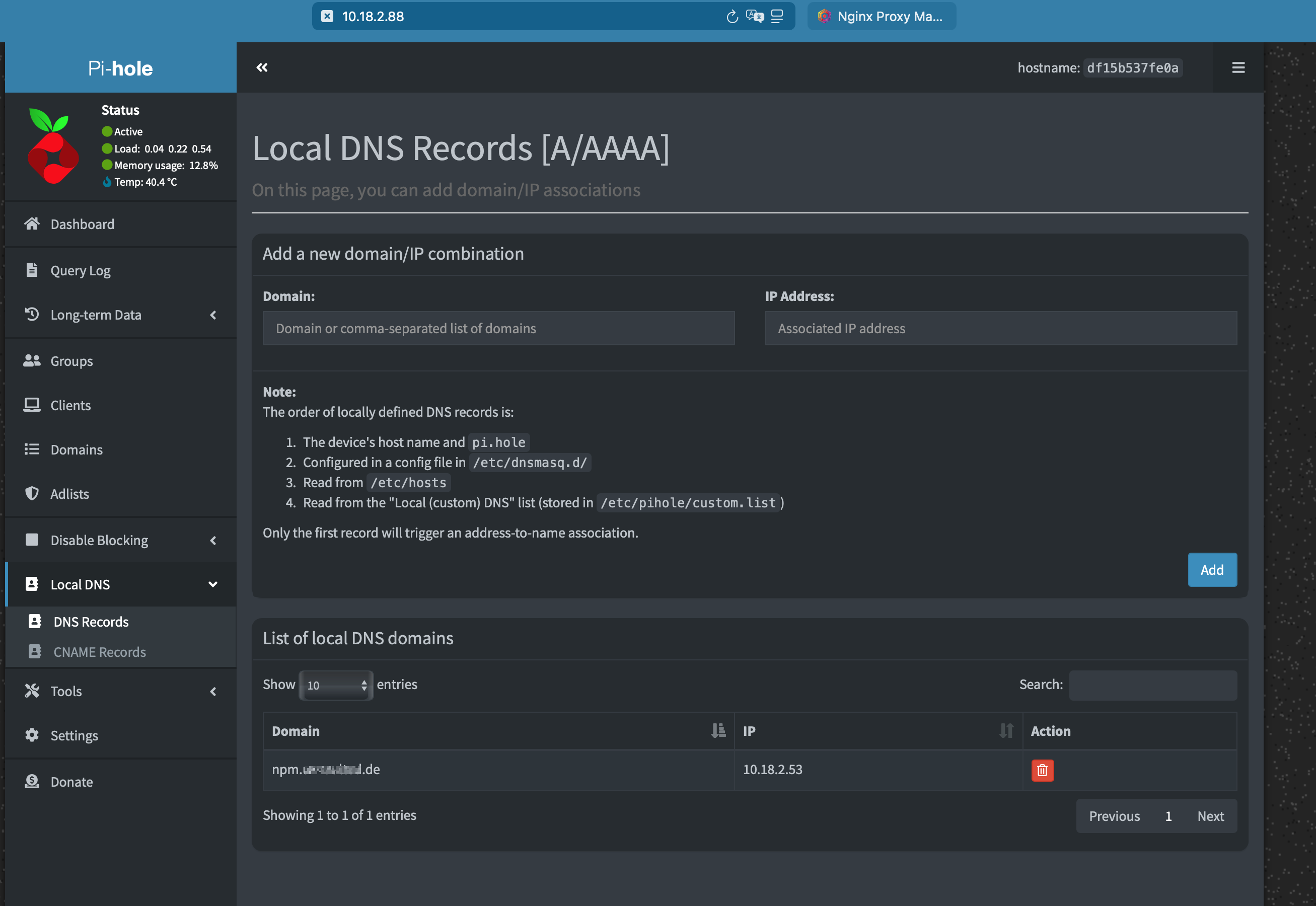 Im Pihole dann ein A Record "nginx.meinedomain.de" auf die IP vom Nginx erstellt.