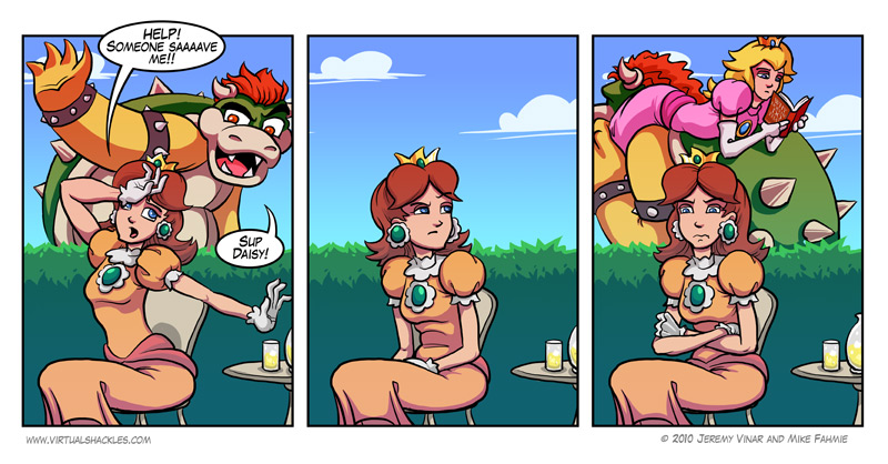 super mario zb. muss mehrere stunden hindernisparcoure unter einsatz seines lebens überstehn um die holde zu retten nur damit sie sich im nächsten spiel gleich wieder fangne lässt, ja sogar nach ka wie vielen anläufen ( mehr als 5 ? bin da nicht auf dem aktuellen stand) hilft er der maid aus der patsche, obwohl es ja auchnoch andere fische im mehr gibt......