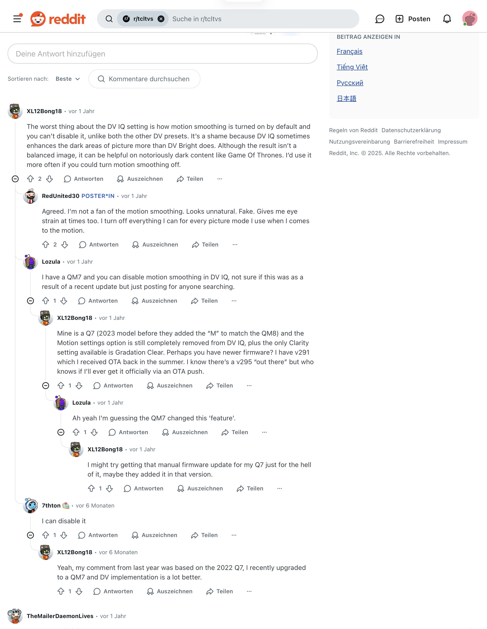 Ganz merkwürdig finde ich auch wenn ich das ganz normale Dolby Vision IQ laufen lasse ohne es abzudunkeln oä ,hat das Bild so einen ganz merkwürdigen soap Effekt dass sie total unrealistisch aus
