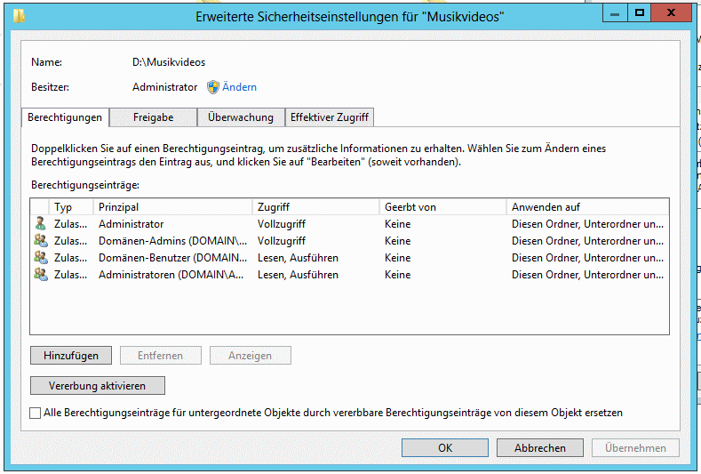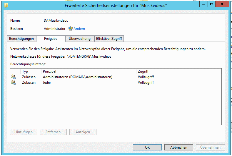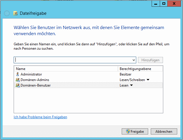 Ich möchte nun, dass Domänenbenutzer meine Freigaben lesen, aber die Inhalte nicht bearbeiten können. Der Domänen-Admin (ich) soll Vollzugriff auf die Freigabeninhalte haben. Die Freigabenkonfiguration wird an folgendem Bild beispielhaft aufgezeigt: